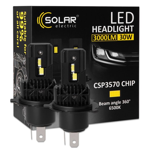Автомампы Solar H4 12/24V 30W 3000Lm 6500K CSP3570 8404S2 (2 шт.) - это передовое решение в освещении, которое имеет множество преимуществ по сравнению с традиционными галогенными лампами и ксеноновыми лампами благодаря своей высокой яркости, долговечности. Одной из ключевых особенностей LED лампы является высокая яркость и интенсивность света. Световой поток лампы 3000 lm обеспечивает исключительную видимость на дороге в любое время и в любых погодных условиях.