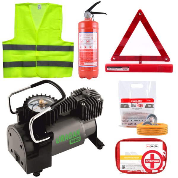 Набор состоит: Компрессор автомобильный Uragan с автостопом 90135 Огнетушитель порошковый ВП2 VP2-X Аптечка медицинская согласно ТУ, мягкий футляр 02-002-M аварийной остановки WT101/BG Буксировочный трос CarLife 4,5т, 5м TR705 Жилет сигнальный Beltex, размер XXL 19100