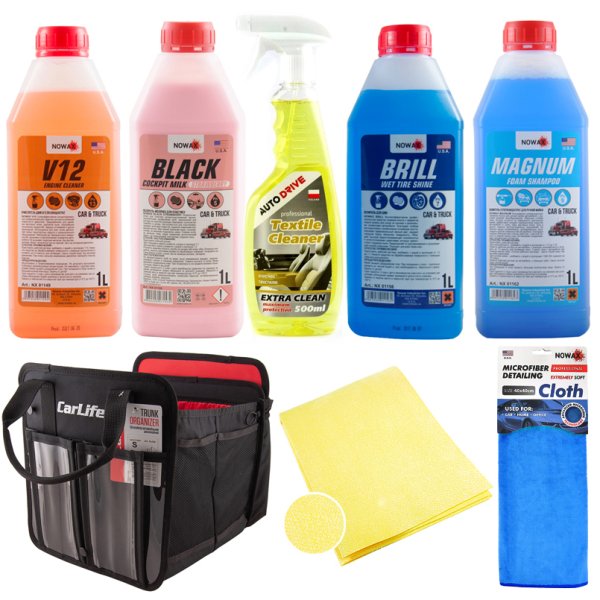 Набор состоит: Nowax Профессиональная тряпка для авто 40*50см (желтая) NX63451 Nowax Полироль-молочко для пластика STRAWBERRY концентрат 1л, NX01188 Nowax шампунь MAGNUM Foam суперкон 1л, NX01162 Nowax Полироль для шин BRILL WET TIRE SHINE 1л, NX01156 Профессиональная тряпка Nowax из микрофибры 40х40см, синяя NX68440 Nowax очиститель поверхности двигателя V12 /