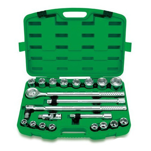В данный набор включены: 16 торцевых 6-гранных головок от 19 до 50 мм, два удлинителя с фиксацией размером 200 и 400 мм, кардан, вороток с шарниром с фиксацией и трещотка на 24 зубца с удлинителем 500мм.