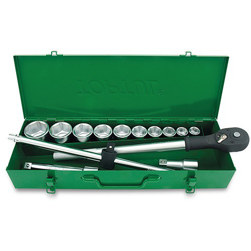 Набір містить: 10 торцевих 6-гранних головок від 22 до 50мм, два подовжувача на 100 і 200 мм, Т-подібний комірець з плаваючою головкою, і потужну тріскачку з реверсом на 24 зубця.