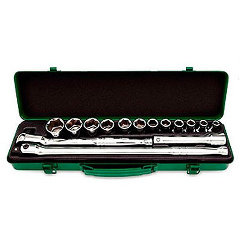 Набір включає в себе: 12 торцевих 6-гранних головок, подовжувач 125мм, комірець з шарніром 380мм і тріскачка на 60 зубців з металевою ручкою.