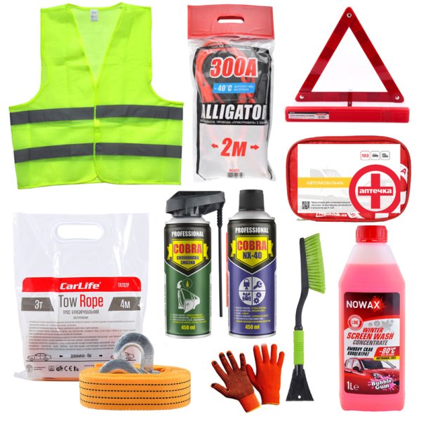 Многофункциональная смазка CarLife CR-40 Multifunctional Lubricant, 450мл CF452 Перчатки покрытые нитрилом WG08 Смазка силиконовая Nowax Silicone Spray Professional Cobra, 200мл NX20700 Буксировочный трос Carlife 3т, 5,5м TR706/P Провода-прикуриватели Alligator 300А, 2м, (полиэт. пакет) BC631 Знак аварийной остановки Аптечка перв.мед.помощи типа АМА1,сумочка (малая) Жилет сигнальный Зимний омыватель стекла концентрат Bubble Gum NOWAX Winter Screen Wash concentrate -80°C 1L NX01171 Щетка Bi-Plast со cкребком BIG-72cм BP-72]]>